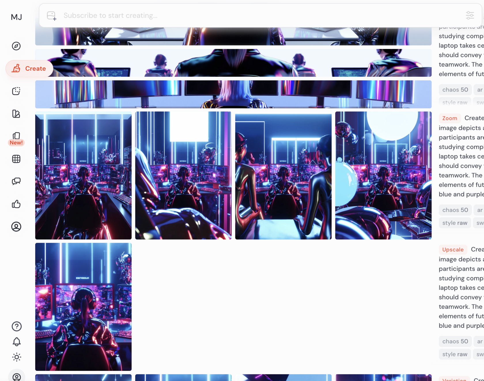 Посмотреть все свои работы можно в Midjourney create, в правом столбце указаны используемые промты.
