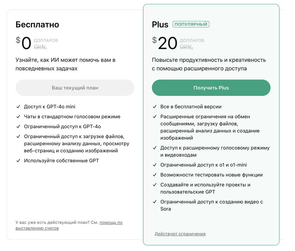Тарифы можете сравнить 👇. В начале использования вполне хватит бесплатной версии ChatGPT. Когда станете использовать его активнее и понадобится Агент ChatGPT или частота запросов выйдет из минимальной, то можно переходить на платный доступ, который стоит $20 в месяц (для США).