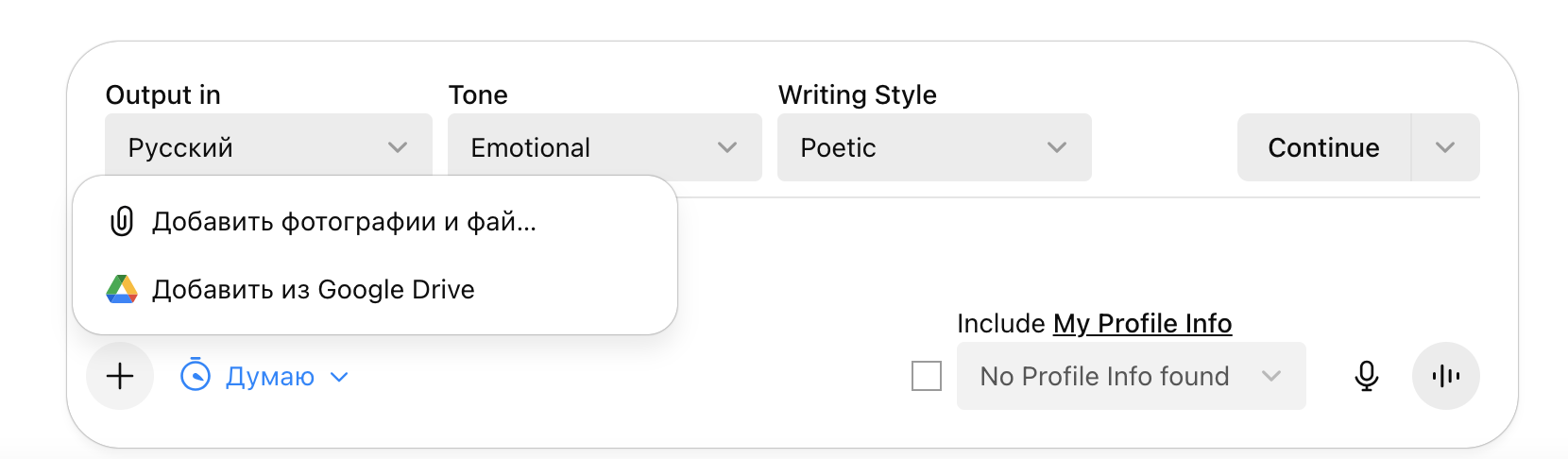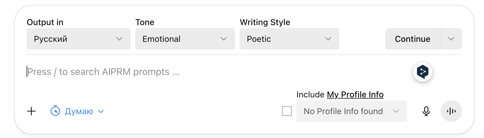 Значок микрофона справа — запрос можно отправлять голосом и также получать. Это особенно удобно в мобильной версии: пришла идея на ходу — наговариваете ее голосом и получаете ответ, дома обрабатываете.