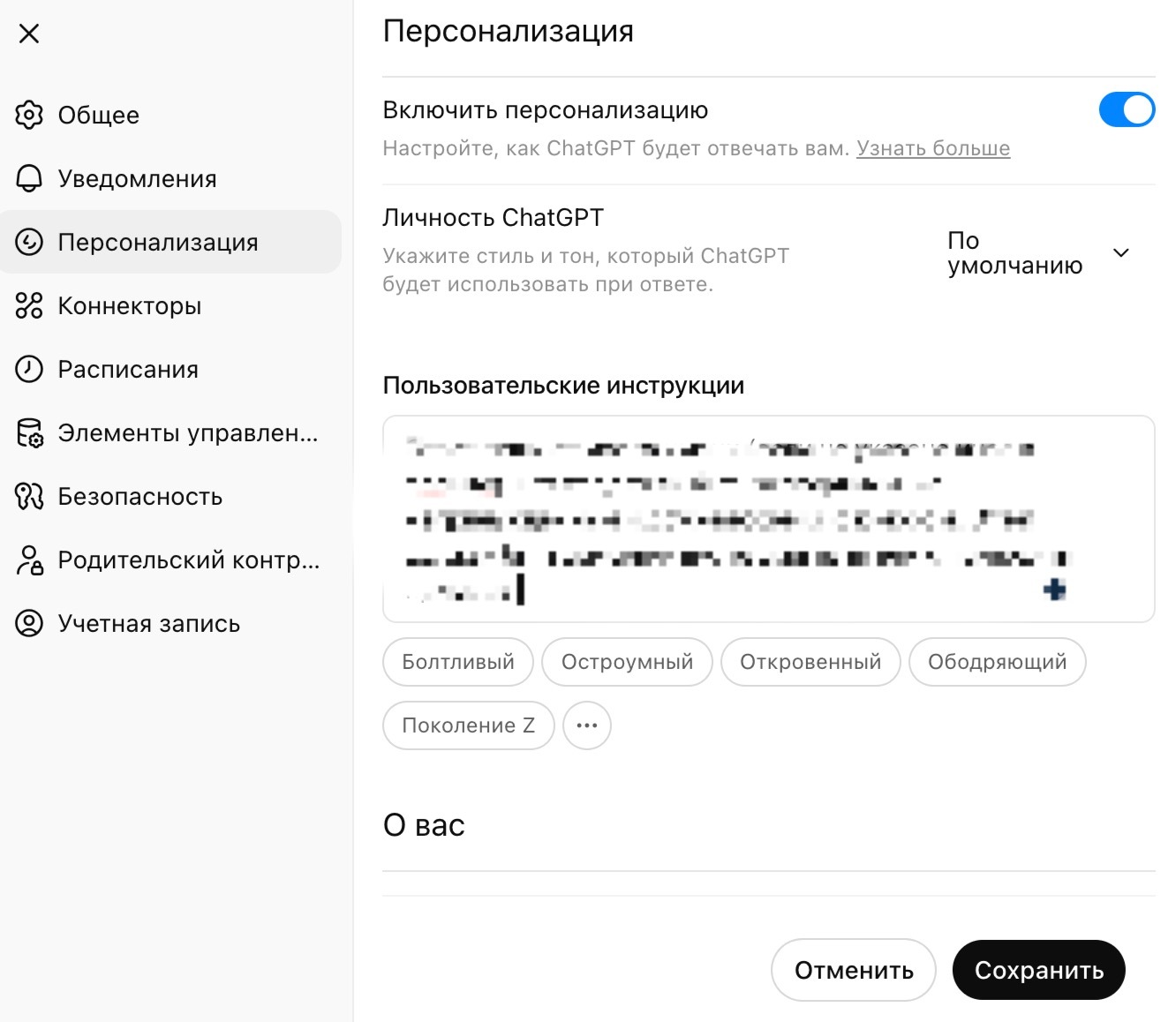 Также важно заполнить Память - в бесплатной версии память может переполняться. Если ChatGPT выдал вам сообщение “Память заполнена”, вы можете зайти в настройки и нажать кнопку “Очистить память”.